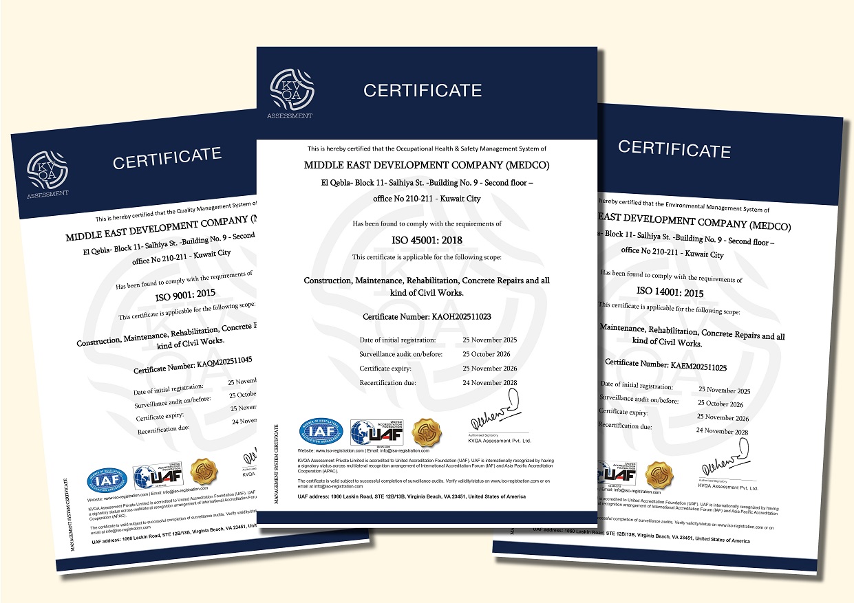 Reaffirming Middle East Development Company (MEDCO) commitment to world-class quality and excellence, Medco proudly announces being awarded ISO 9001, ISO 14001 and ISO 45001 certifications approved by the acclaimed KVQA Assessment Private Limited Certification.